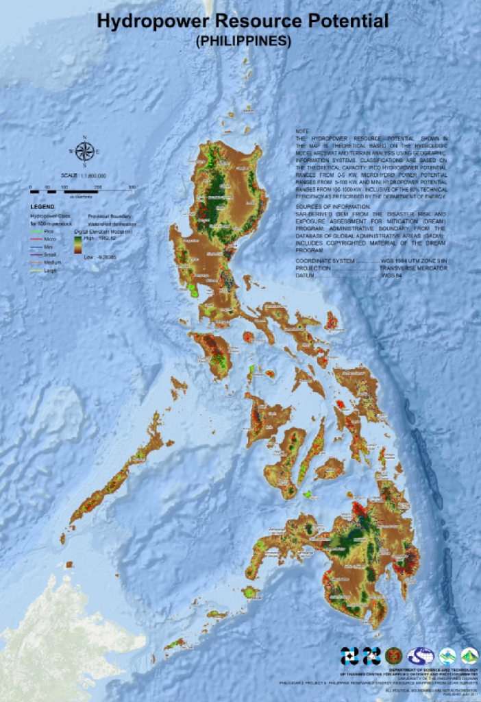 In the Philippines, hydropower is also the most dominant source of renewable technology. Studies indicate untapped potential reaching 13,097 megawatts. 86% is estimated to be suitable for large hydropower plants in 18 potential sites around the country, while the rest can be mini- and micro-hydropower plants at 888 locations.[11] Figure 44 maps the resource potential in areas across the Philippines according to theoretical capacity. It also highlights how remote mountainous areas that cannot be reached by on-grid power favor hydropower.